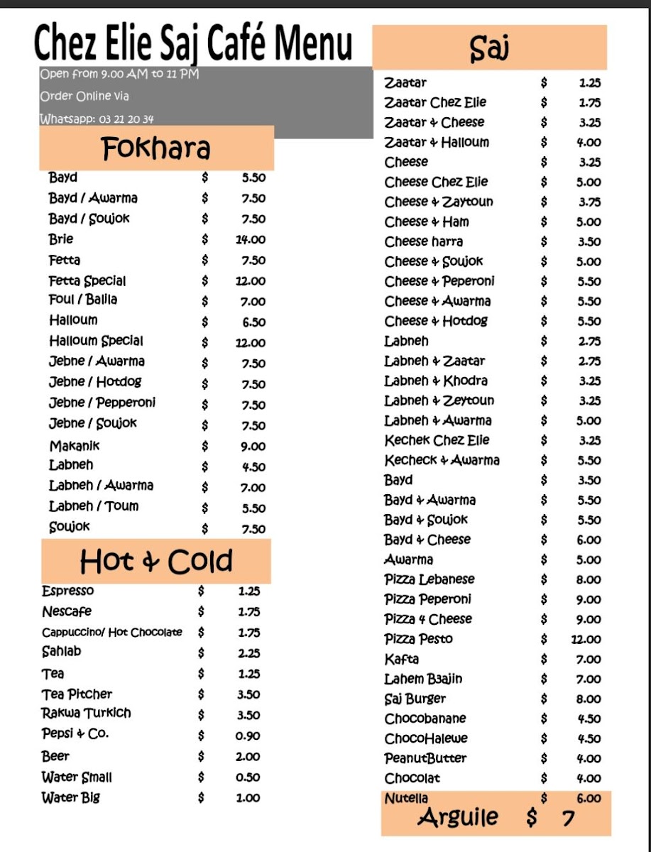 Chez Elie Fokhara & Saj Menu